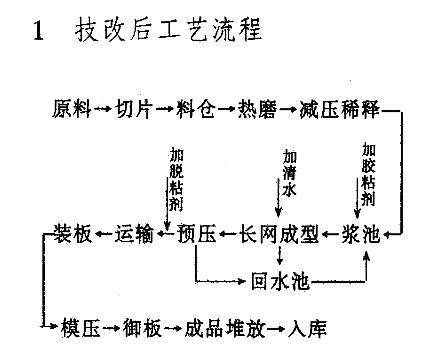 此系統(tǒng)使貯漿池和預壓工序之間的水重復循環(huán)使用,可解決廢水污染問題。但是,這樣勢必造成板坯中可溶物比常規(guī)方法含量高、熱壓時粘板的可能性增大、成品表面顏色較重等問題。因此應采用如下措施:長網(wǎng)成形后,向模坯表面噴射少量清水,既沖淡了板坯表面的可溶物濃度,又補充了熱壓后失去的水分。在必要時使用脫模劑,方法是將脫模劑噴灑在模坯上,或采用具有抗粘性能的聚四氟乙烯處理熱壓板。